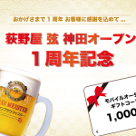 2023年5月31日 / 最終更新日時 : 2023年5月31日 admin イベント情報 【荻野屋 弦 神田】2023年6月1日~1周年記念キャンペーンを開催いたします 2023年6月6日、荻野屋 弦 神田は開店1周年を迎えます。日頃のご愛顧に感謝し、特別なキャンペーンをいたします。2023年6月1日(木)からモバイルオーダーで使える1000円ギフトカードがあたるTwitterキャンペーンを開催します。6月5日(月)からは一杯目の生ビールを100円でご提供いたします!是非お見逃しなく!