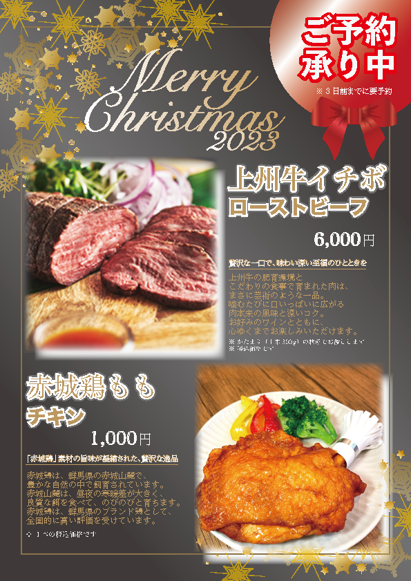 「上州牛ローストビーフ」「赤城鶏ももチキン 」事前予約開始のお知らせ